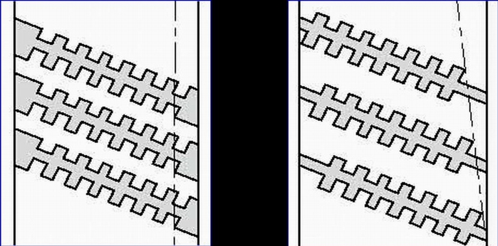 左圖是軸向剃齒刀容屑槽排列; 右圖是徑向剃齒刀容屑槽排列